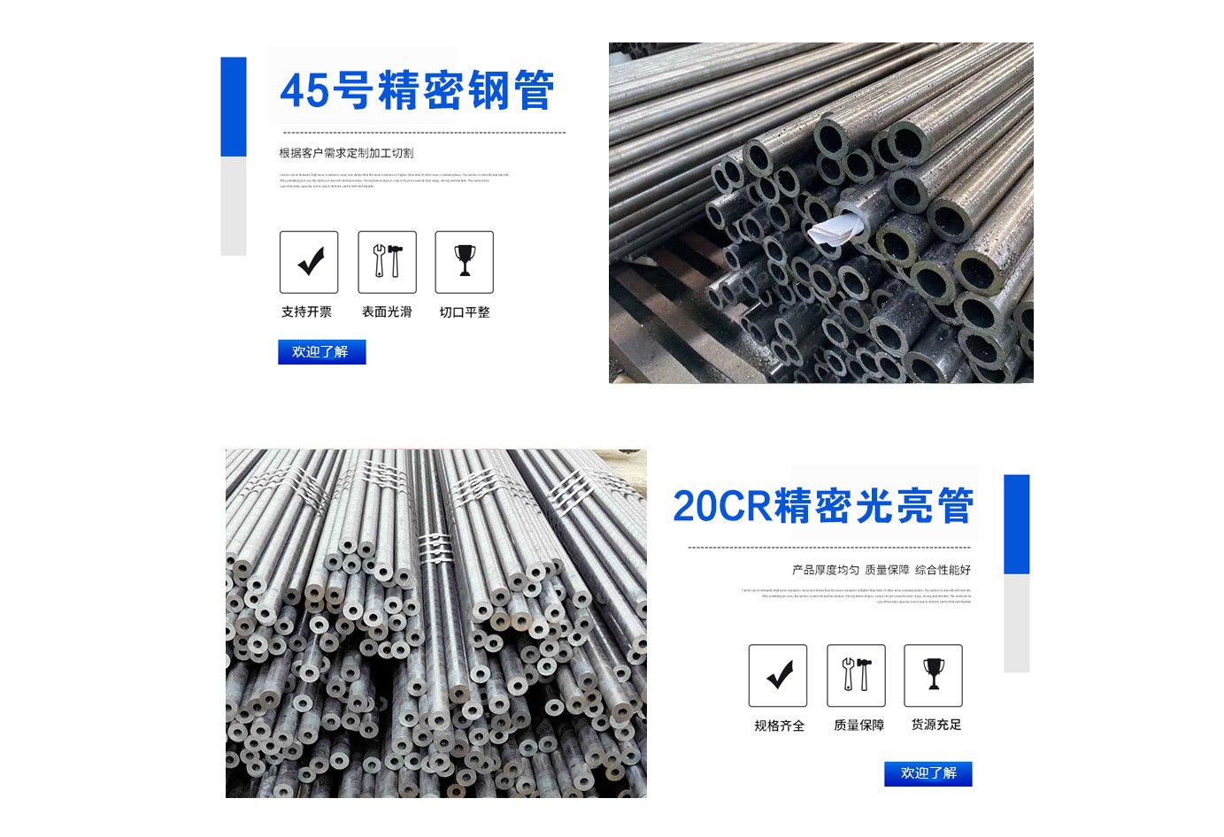 山東海誠(chéng)金屬制品有限公司主要生產(chǎn)20#精密毛細(xì)鋼管,45#精密鋼管,Q345B精密光亮鋼管,20cr精密光亮無(wú)縫鋼管,40cr精軋光亮無(wú)縫鋼管,精密無(wú)縫鋼管生產(chǎn)制造廠(chǎng)家等產(chǎn)品?! ∥夜颈小耙钥蛻?hù)為中心,以低價(jià)高品質(zhì)為基礎(chǔ),以客戶(hù)滿(mǎn)意為目標(biāo)”的經(jīng)營(yíng)理念,以?xún)?yōu)惠的價(jià)格來(lái)贏(yíng)得用戶(hù)的信賴(lài)。 我公司成立迄今,正是由于各界朋友們對(duì)于我們的持續(xù)支持與關(guān)懷,及本公司全體同仁辛勤的耕耘與付出,使公司持續(xù)發(fā)展與茁壯成長(zhǎng)。展望未來(lái),我公司人懷著感恩之心,更加追求卓越的業(yè)績(jī),來(lái)回饋社會(huì),服務(wù)顧客?! ∥夜菊\(chéng)摯的希望與新老客戶(hù)在互惠互利、友好合作的基礎(chǔ)上,建立良好的貿(mào)易關(guān)系,歡迎各單位來(lái)人來(lái)函到我企業(yè)指導(dǎo)工作,我們有著一支的員工團(tuán)隊(duì),我們堅(jiān)信企業(yè)的競(jìng)爭(zhēng)、產(chǎn)品的競(jìng)爭(zhēng)、技術(shù)的競(jìng)爭(zhēng),歸根到底是人才的競(jìng)爭(zhēng),只有具備了高素質(zhì)的員工才能形成高素質(zhì)的企業(yè),才能掌握市場(chǎng)競(jìng)爭(zhēng)的主動(dòng)權(quán)?! ∥夜纠砟睿骸罢\(chéng)實(shí)守信,雙贏(yíng)有泰”,我們對(duì)待每位戶(hù)都遵循行業(yè)誠(chéng)信,不虛報(bào)產(chǎn)品價(jià)格,客戶(hù)下訂單后我們抓緊生產(chǎn),保證工期,我們?cè)概c新老客戶(hù)本著精誠(chéng)合作、互惠互利的原則建立廣泛的合作關(guān)系,相信通過(guò)我們的共同努力定能共創(chuàng)美好未來(lái)!...